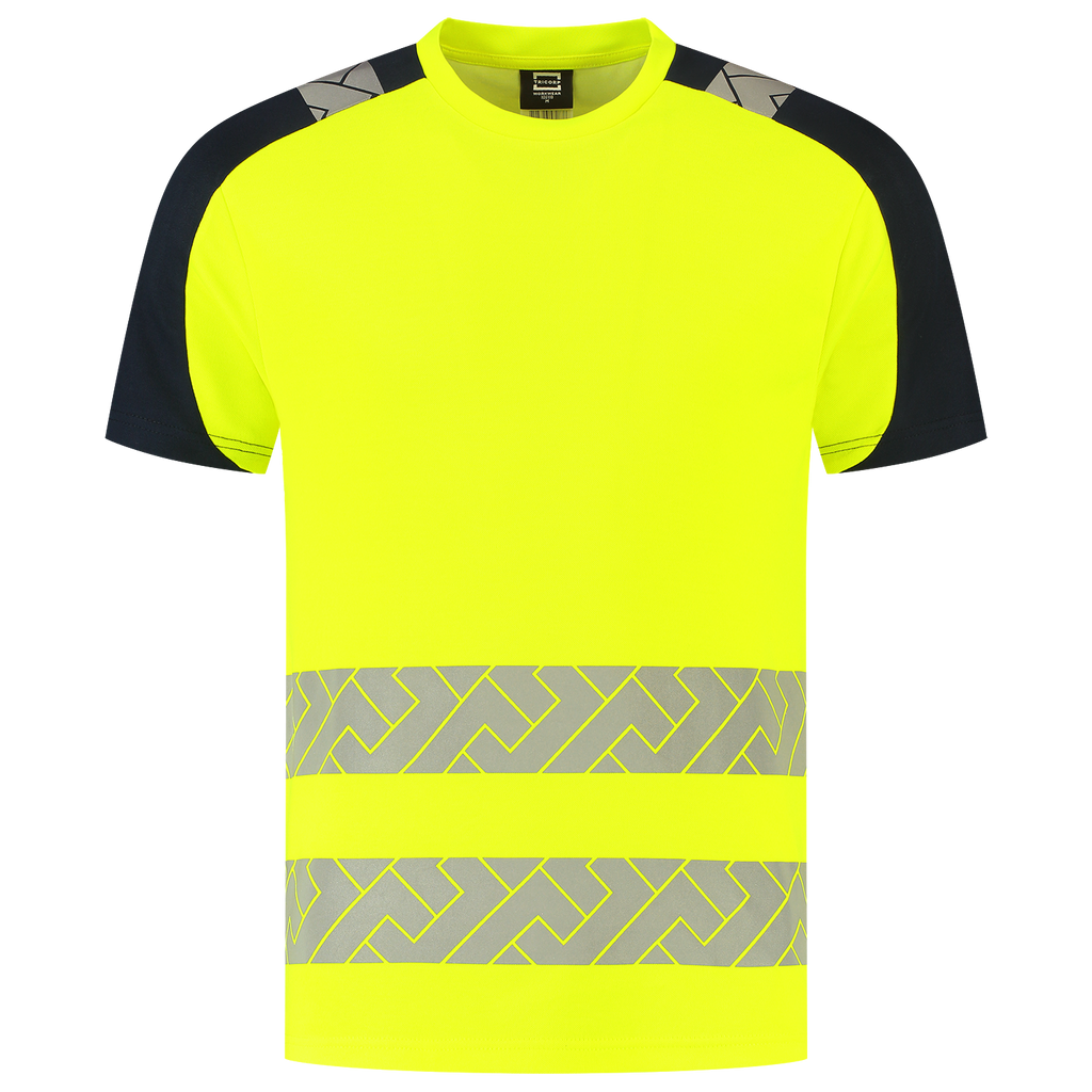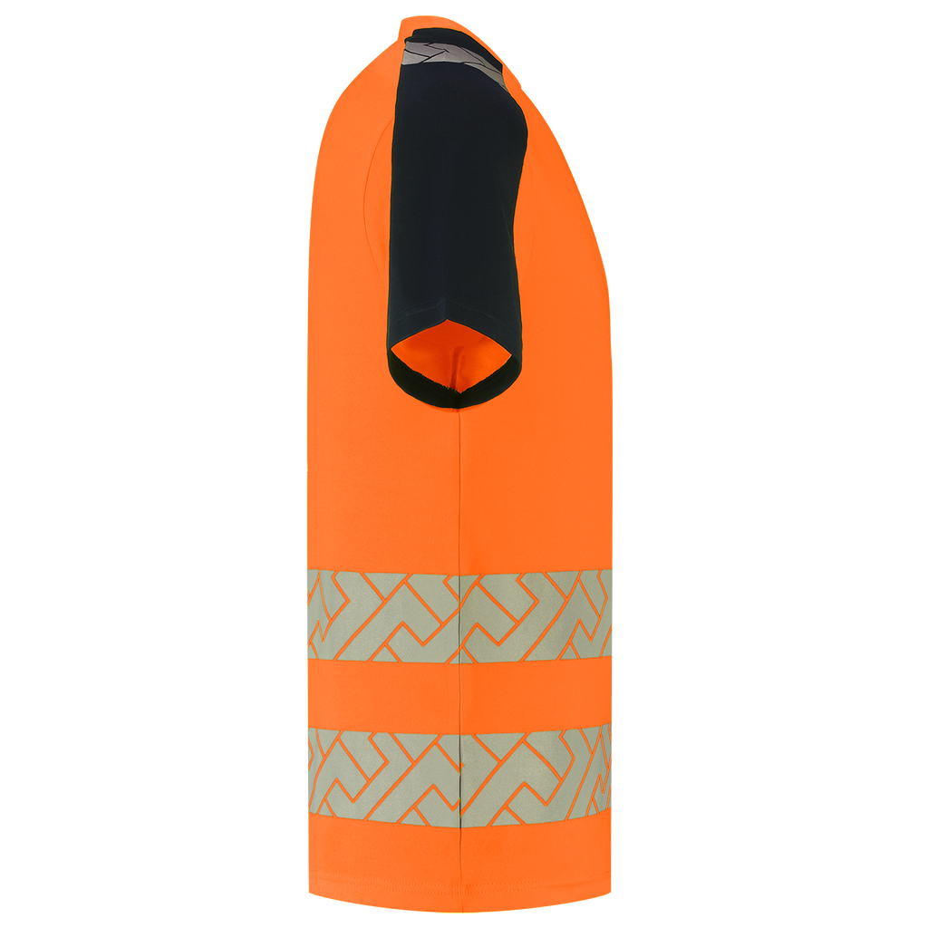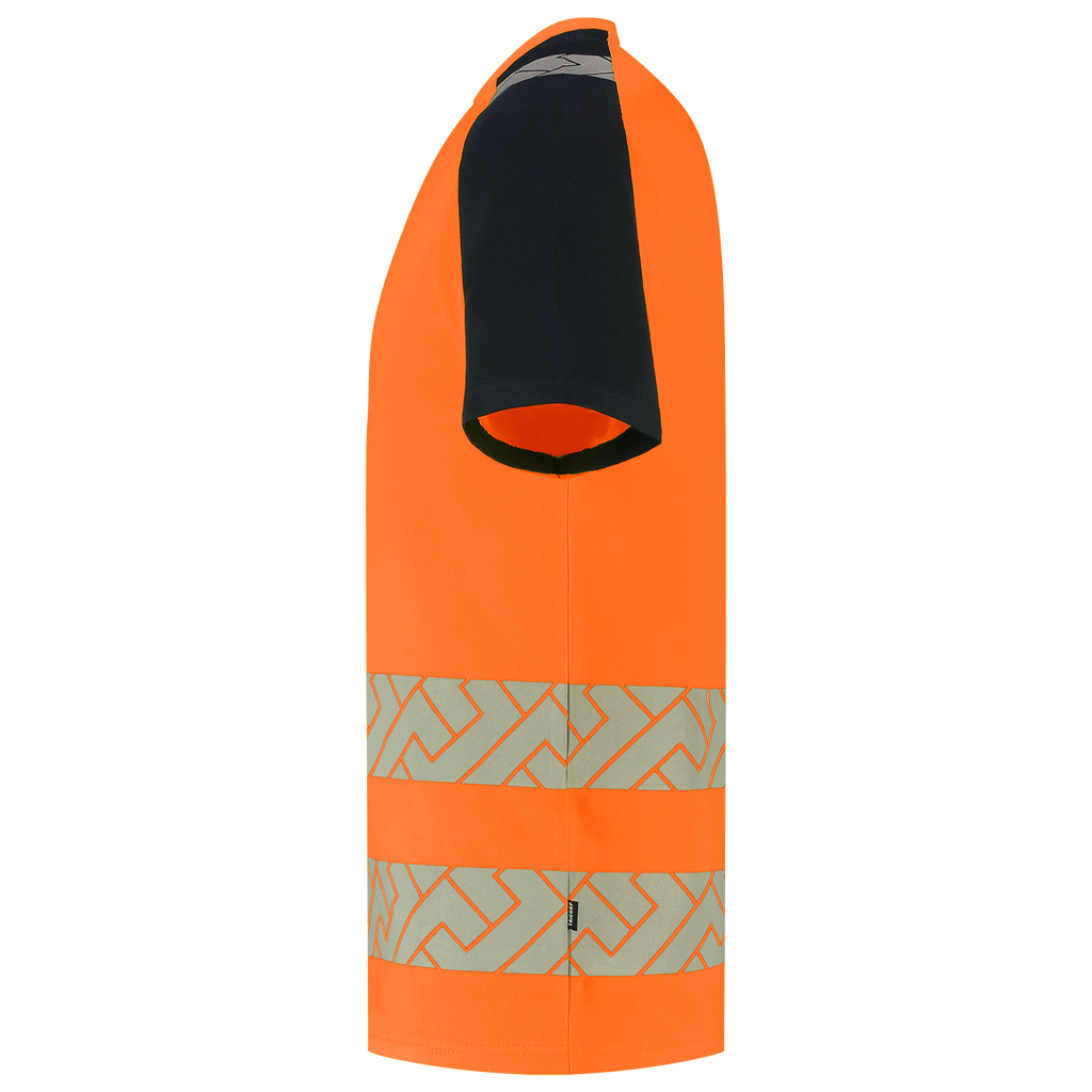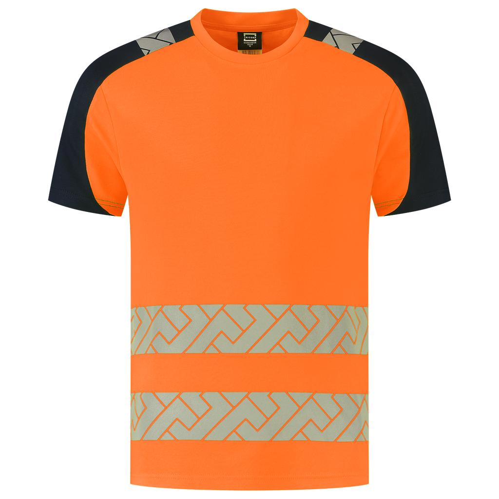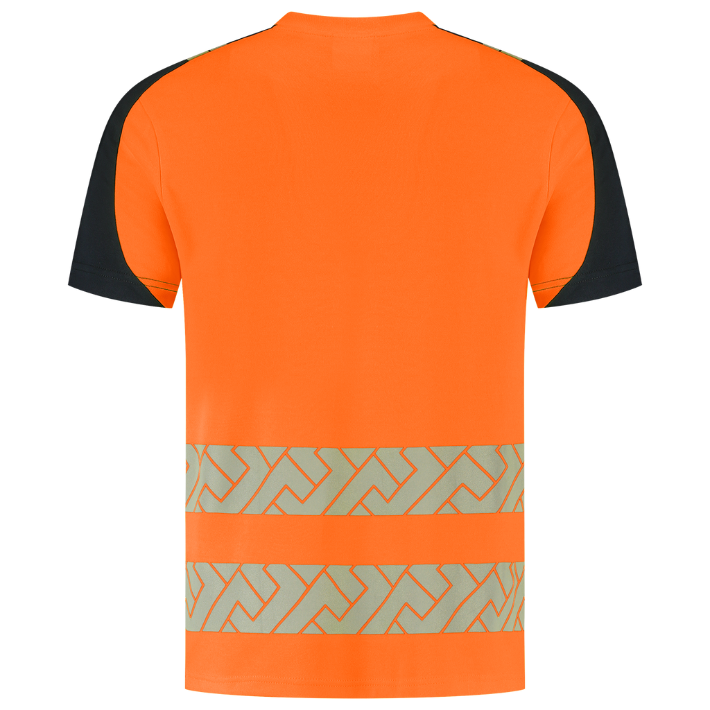 The High Vis Redefined T-shirt from Tricorp is designed for professionals who need high visibility and comfort during work. This reflective work shirt is made of 100% recycled polyester, has a fabric weight of 150 g/m2 and features Polygiene StayFresh™ technology, which ensures long-lasting freshness; even during long working days. Thanks to the segmented reflection around the torso and shoulders, the T-shirt offers excellent visibility, without compromising your freedom of movement. It complies with the EN ISO 20471 class 2 standard (class 1 for size XS) and provides reliable protection against harmful UV radiation thanks to the UPF 40+ classification according to the EN 13758 standard for UV protective clothing. The breathable and lightweight birdseye construction provides extra comfort, while the regular fit and round neck contribute to a comfortable fit. The T-shirt is available in sizes XS to 5XL and available in the colors Fluor Orange-Ink and Fluor Yellow-Ink. In addition, the product will continue to meet the applicable safety standards for at least 50 washes of 40 degrees. Combine this T-shirt with other items from the High Vis Redefined line for a complete, professional and sustainable work outfit.