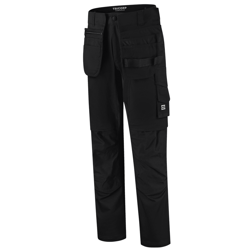 The Functional Stretch Redefined Tool Pockets Work Pants from Tricorp is for professionals who demand maximum freedom of movement and wear resistance. Made from a sturdy yet flexible material blend of 58% recycled polyester, 40% organic cotton and 2% elastane, with a fabric weight of 250 g/m2, these pants not only offer a sustainable choice, but also maximum freedom of movement. Thanks to strategically placed 4-way stretch panels of 90% polyamide and 10% elastane in the crotch and back of the knees, these work pants move smoothly with you. The raised back panel is also supported with 4-way stretch panels, so the pants always fit perfectly. The combination of 2-way stretch twill and ventilating zones in the back of the knees ensures optimal comfort during physically demanding work. Thanks to smart details such as a ruler pocket, smartphone pocket with flap, detachable D-ring, belt loops, thigh pocket with volume pleat and Cordura® reinforcements in wear-prone areas, these work trousers are made for action. The improved fit, choice of three lengths and sturdy zipper ensure that you are always ready for your job. The wear-resistant Cordura® knee pockets, which are also adjustable in height, are also ideal for anyone who regularly works on their knees. In addition, the detachable and adjustable tool pockets with smart pocket layout are perfect for storing tools, screws or your smartphone. One of the tool pockets can even be closed with a zipper, so your valuables stay safely stored. The tool pockets can be attached to both the front and the side of the pants, depending on your preference and work. The Work Pants Functional Stretch Redefined Tool Pockets are certified according to GRS, OCS and OEKO-TEX® Standard 100 and therefore offer both wearing comfort and responsible product properties. The model is available in sizes 42-66 and available in the colors Black and Ink. The pants can be combined with other items from the Redefined line for a complete, professional and durable work outfit.